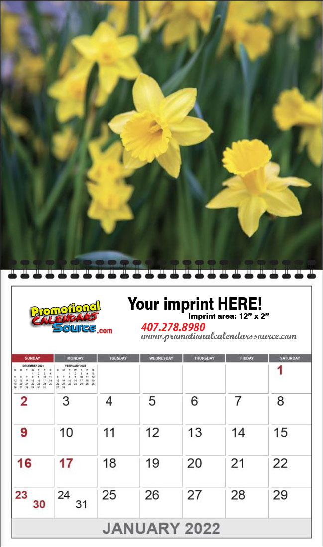 A promotional Flowers Calendar with 12 great images on a large size customized calendar. Imprint your advertisement on the 12" x 2" imprint area for all year exposure.