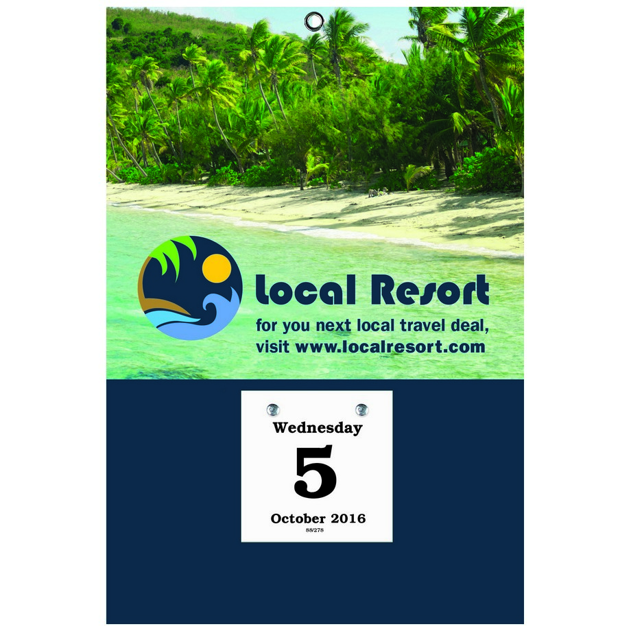 Daily Date Promotional Calendar X-Large. Bookbound Daily Dates are our standard calendars. Custom printing with 1-4 colors. Calendar pad begins in mid-December for early distribution and assured wall space. Metal hardware allows the calendar to be refilled. Imprint method: 4-color digital printing, mounted on bookboard. Hardbound book cover-like construction with wrapped edges for a rich and distinctive finish. Embossed texture finish. Back punched with silver metal eyelet for easy hanging and increased durability.