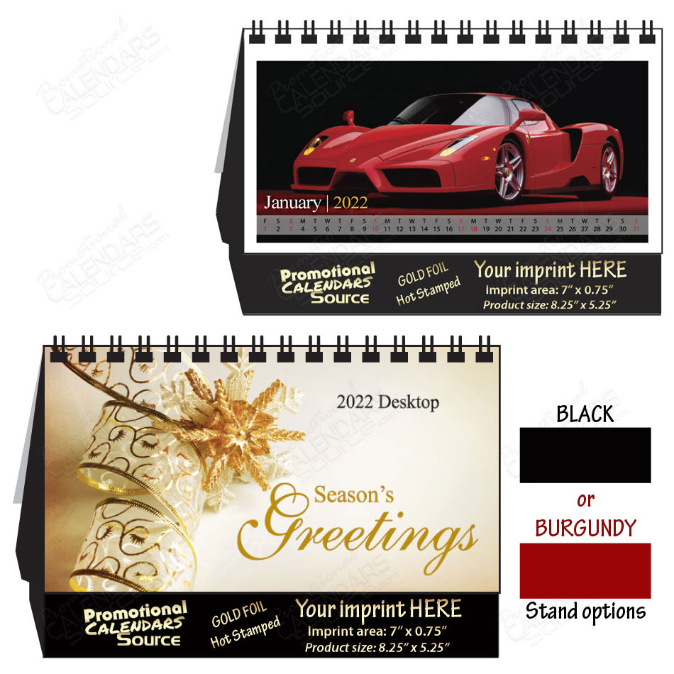 Item JC-706B is a Tent Desk Calendar decorated with Fast and Furious CAR images. Constructed with a sturdy stand made of 70 mill. Linen finish stock and pages with 8 pt. Gloss Cover. It is available with BLACK or BURGUNDY color stand customized with GOLD Foil imprint. Your Ad copy is Foil Hot-Stamped on the bottom of the stand on both sides. Great quality product to promote your business and show appreciation to your recepients.