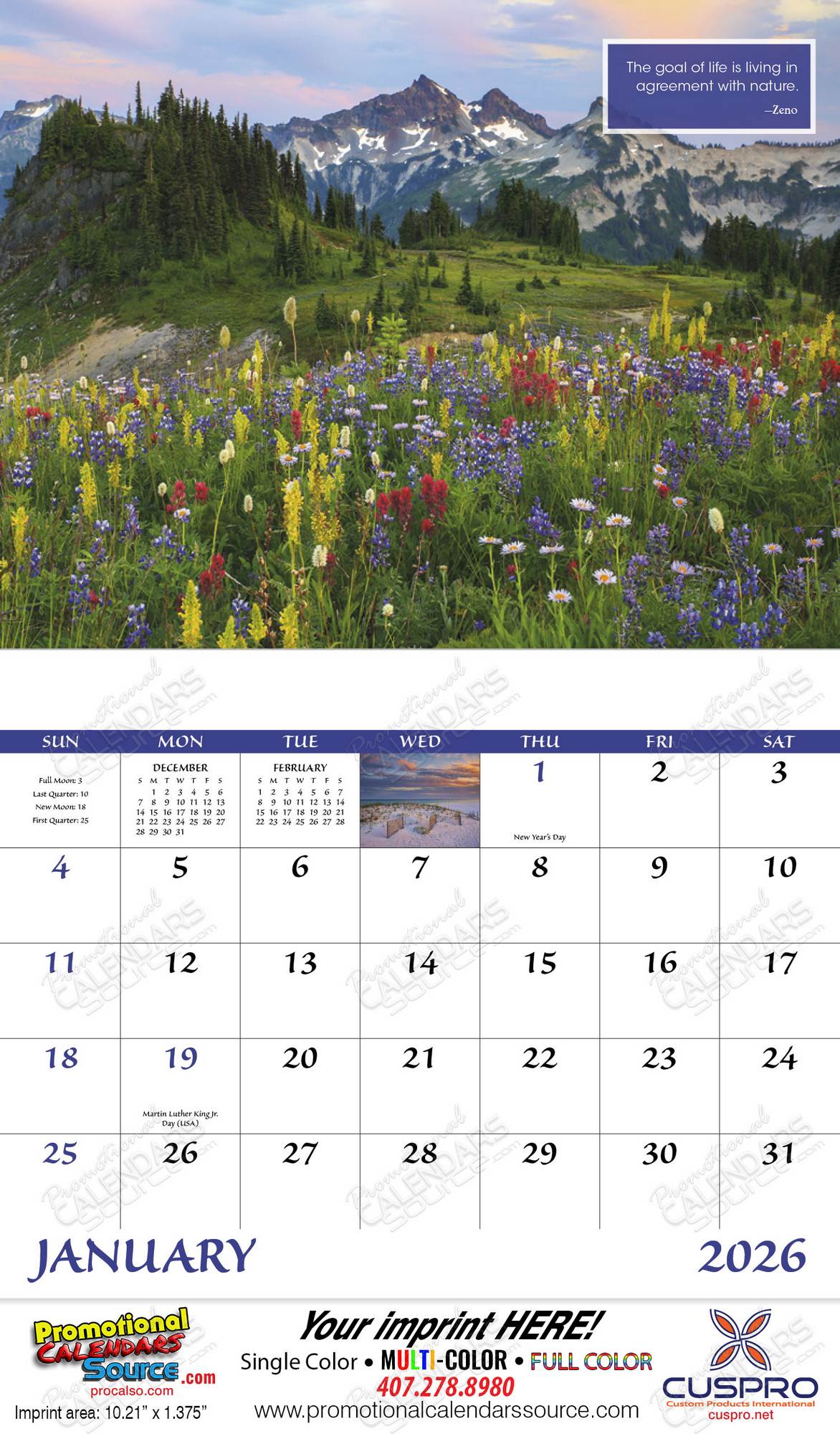 Spectacular scenes and inspiring quotes support your message. Size open 11" x 19". Inspirations for Life wall calendar is a perfect inspirational gift for your current customers and prospective ones.