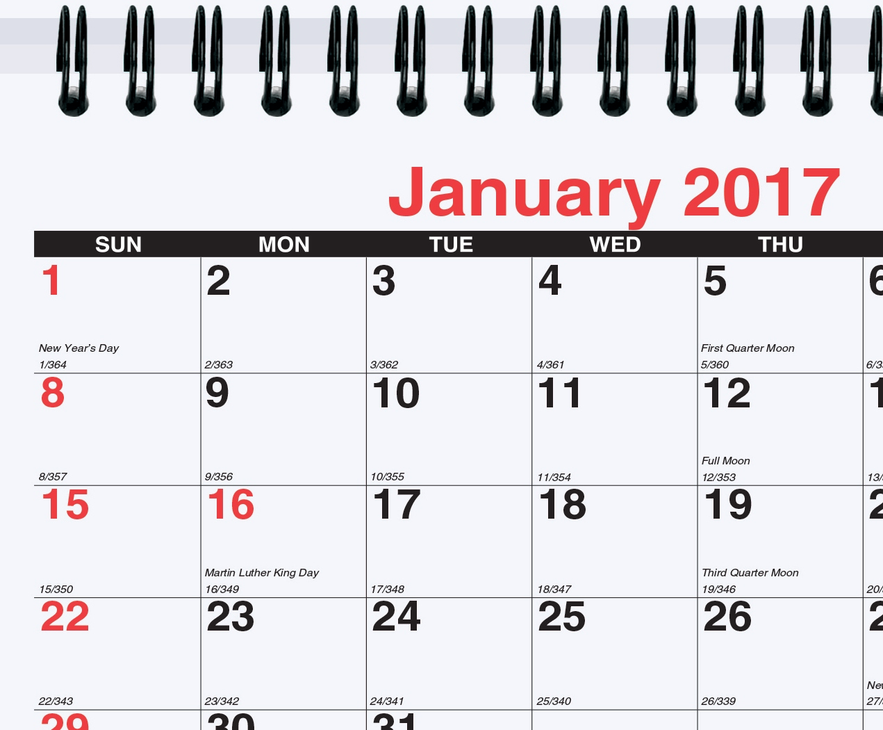 Calendar pads are printed in red & black ink on white offset stock and includes American holidays, moon phases, and Julian dates. Pads are wire-O bound into board. Contact us with your design needs so we can assist you finalize the details of your calendar.