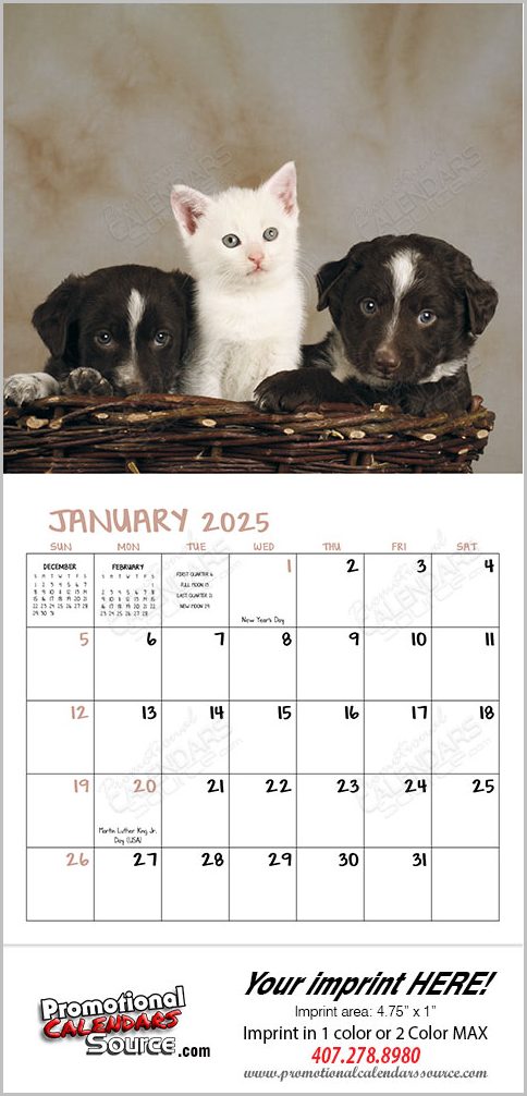 Puppies & Kittens Mini Promotional Calendar . Mini Calendar to promote your business. Filled with images of Puppies & Kittens is perfect for Pet lovers of all ages. Enjoy these adorable images. Dogs, Cats. 12 months dispayed with big blocks.