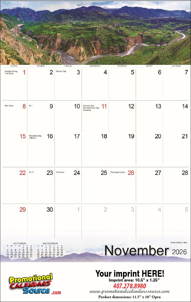 Scenic Large Block Memo Appointment Calendar 2023 with Staple Binding. Scenic Images from around the world decorate this appointment calendar with large date blocks, a 12 month calendar of great quality with innovative desing. Certainly will attract attention and be admired all year long, promoting your advertising message. Custom printed with your business information and logo for a year long exposure will be a great and appreciated gift.