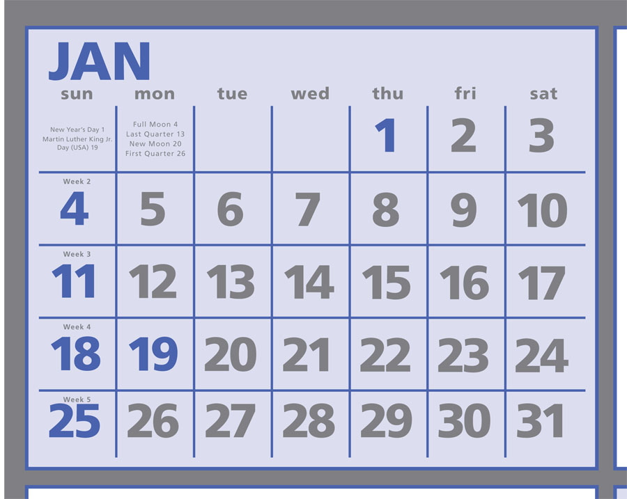 Trust this large Year-At-A-Glance calendar with 12 Months-In-View grids pre-printed in Blue & Gray for your business advertising. Customized with your information and the grids large numbers, will be noticed from far away, advertising your business all year long. Your ad copy imprinted up to four colors. Four color process available.